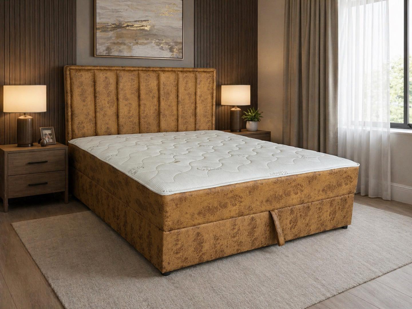 Димензија на легло: 160x200cm и 180x200cm Легло: жичано јадро Боја: се изработува со штоф по избор на купувачот.